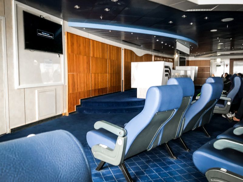 Achtung: Da der Juni noch Vorsaison ist, war die Fähre nicht einmal zur Hälfte gebucht. Ich schätze es waren ca. 750 Passagiere an Bord, maximal kann eine Fähre dieser Größe rund 3000 Passagiere befördern. Natürlich kann es bei mehr Passagieren auch gleich enger werden.