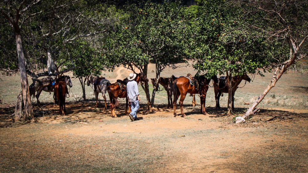 Auf dem Weg durch das Tal triffst du Kubaner auf ihren Kutschen und Bauern die Ihre Feldarbeit mit einem Bullen erledigen. Du siehst Mangobäume, Bananenstauden und riesengroße Tabakplantagen. Neben Kühen, Schweinen und Pferden wird dir auch hier und da ein Bulle begegnen.Unsere kleine Gruppe bewegte sich nur langsam, es war viel zu heiß für die Pferde. Für mich aber eine tolle Möglichkeit nebenher Fotos zu schießen.
