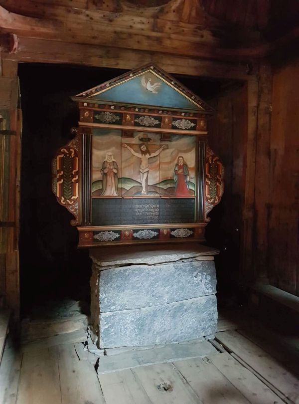 Schon von außen beeindruckt das Gebäude durch reichhaltige Verzierungen mit christlichen und vorchristlichen Symbolen. Im Inneren wird der Begriff “Stabkirche” unmittelbar deutlich durch wuchtige Stämme, die das einem umgedrehten Schiff ähnliche Dach tragen.